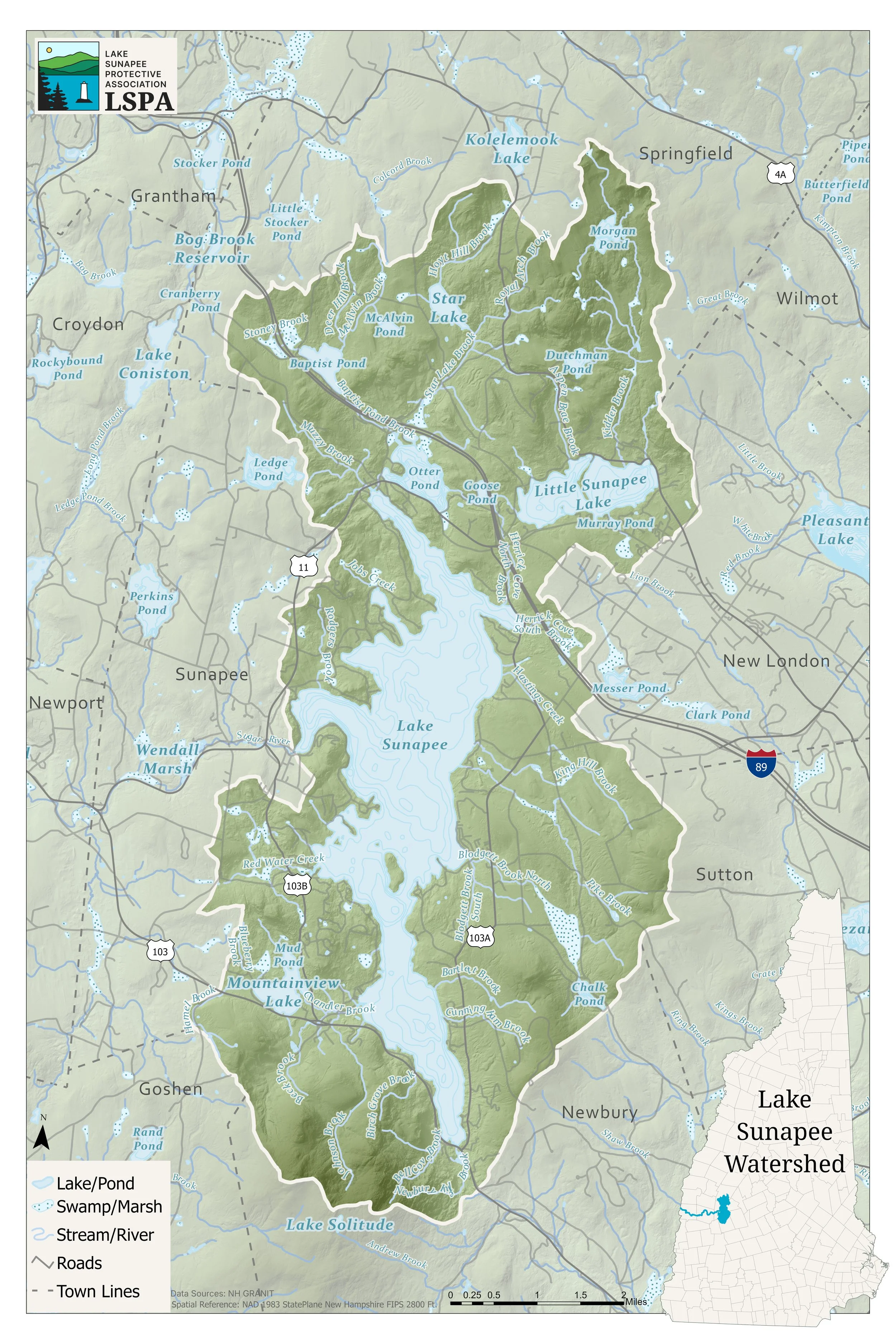 The Lake Sunapee Watershed includes all of the land surface that drains into Lake Sunapee. All told, the watershed area is spread throughout six towns - Newbury, Springfield, Sunapee, New London, Sutton and Goshen and is approximately 47 square miles. It includes 13 lakes and ponds with Lake Sunapee being the largest and Murray Pond the smallest.